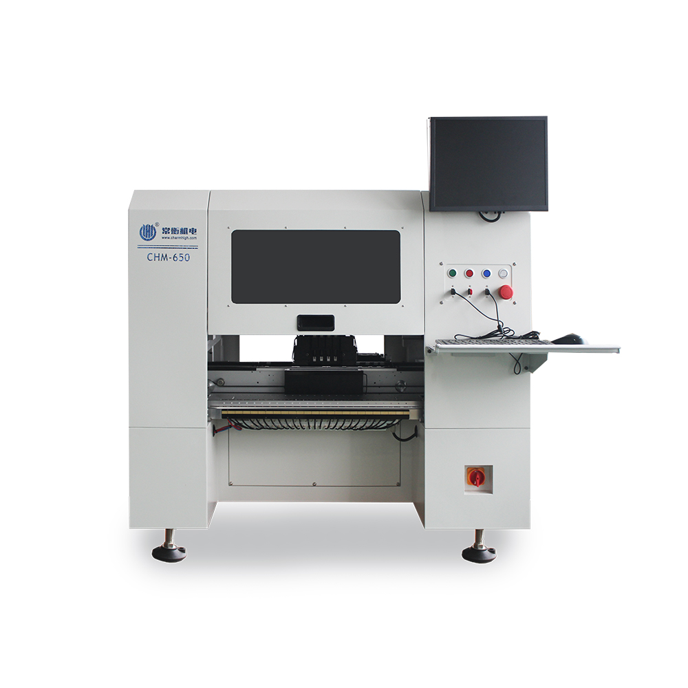 CHM-650 Pick and Place Machine is characterized by 50 feeder stacks, 4 heads capable of 360-degree rotation,support for Yamaha pneumatic feeders ,stick feeders with tubular components, automatic correction to pick components, integrated operation with built-in industrial computer.